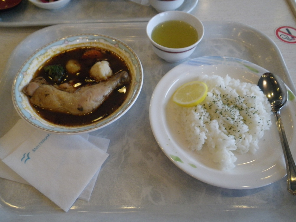 メニューを見ながら何にしようか悩んだ挙句、本州では見かけないタラコ丼を注文。650円と安価ながら味はGOOD。650円ならそこら辺の定食屋より安いんじゃない?フェリーの食事は高くて不味いイメージが先行するけど、最近はかなり改善されているようだ。相棒はスープカレーを注文。