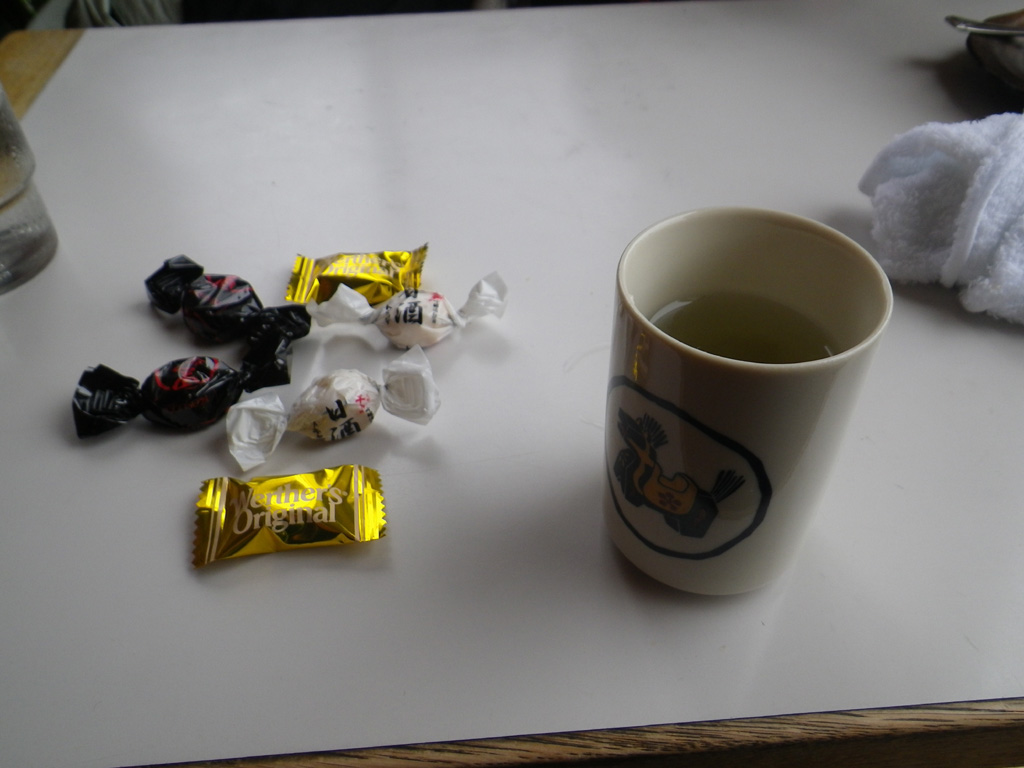 30分ほど休憩して帰り支度を始めたとき、店のおばあさんが、「ちょっと待ち、今お茶を淹れるから・・・」と暖かい昆布茶を出してくれた。飴まで頂き本当に感謝!コーヒーでは足りなかった暖かさが昆布茶で足りた気がする。