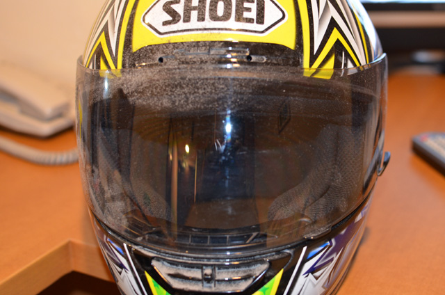 朝、ヘルメットを見るとかなり汚れていることに気づく。ヘルメットの真ん中以外は真っ白。これを見ると昨夜の火山灰の酷さがよくわかる。