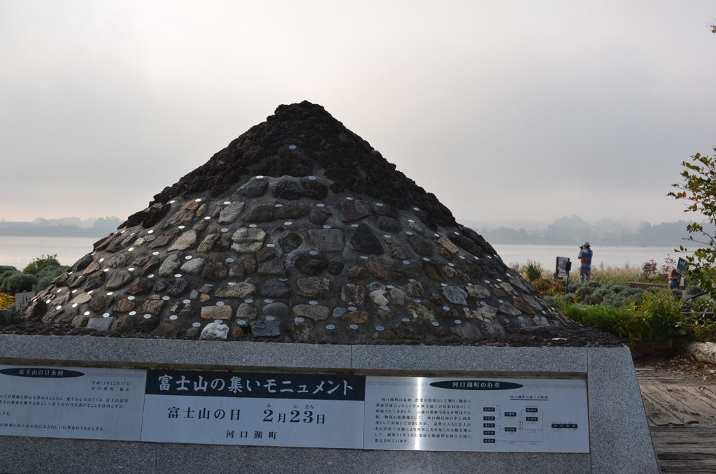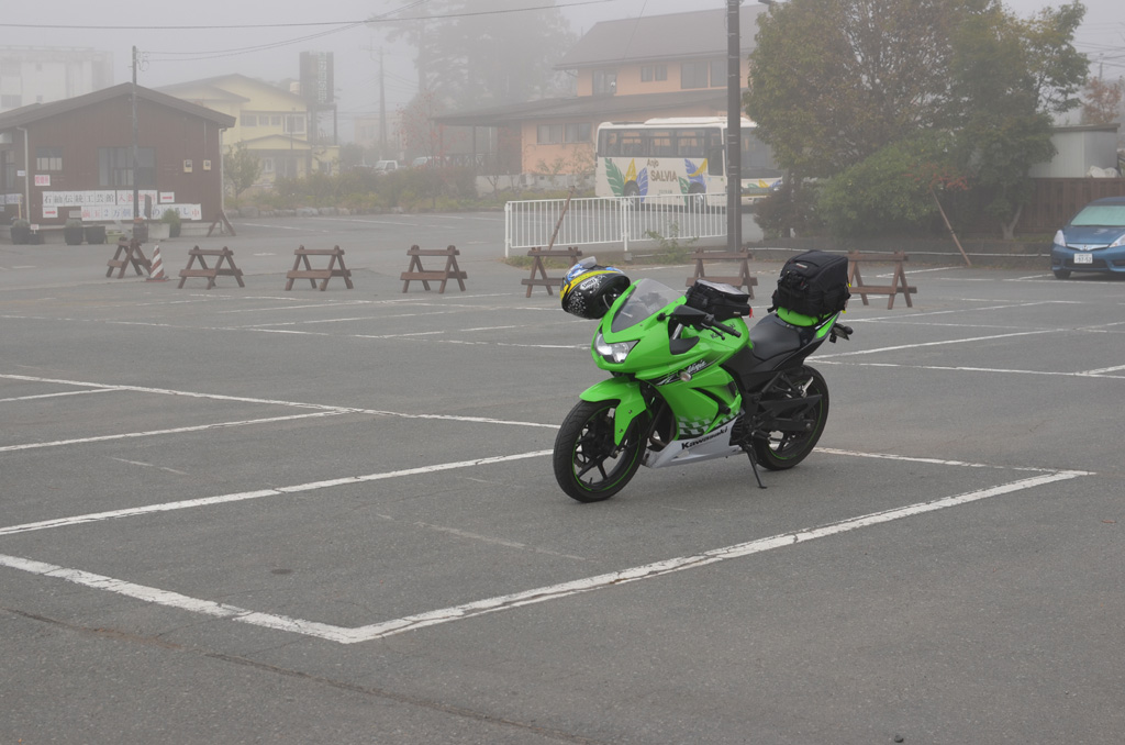 山の中で長いトンネルを越えたとき、辺り一面が霧で真っ白になり視界が極端に悪くなる。この霧では富士山が見えないのではないか、と心配しつつ、河口湖にさしかかる。とりあえずどこかにNinjaを停めようと大池公園というところで一旦駐車。朝からラジオ体操をしている人や釣り人がいて、結構大きな公園だ。しかし霧が酷くて向こうの景色がまったく見えない。