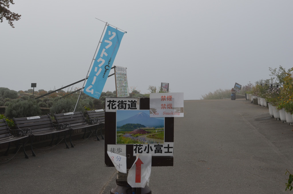 そんな景観イマイチの状態でも駐車場には結構クルマが停まっている。キャンプテントも見えるので夜中から車泊している人もいるのだろう。周りに目を向けてみると、ここから徒歩2分の先に「花小富士」と呼ばれるビュースポットを見つけるが、この状態では何も見えないだろう。写真のように霧がなくなると素晴らしい景色らしいのに!(写真)