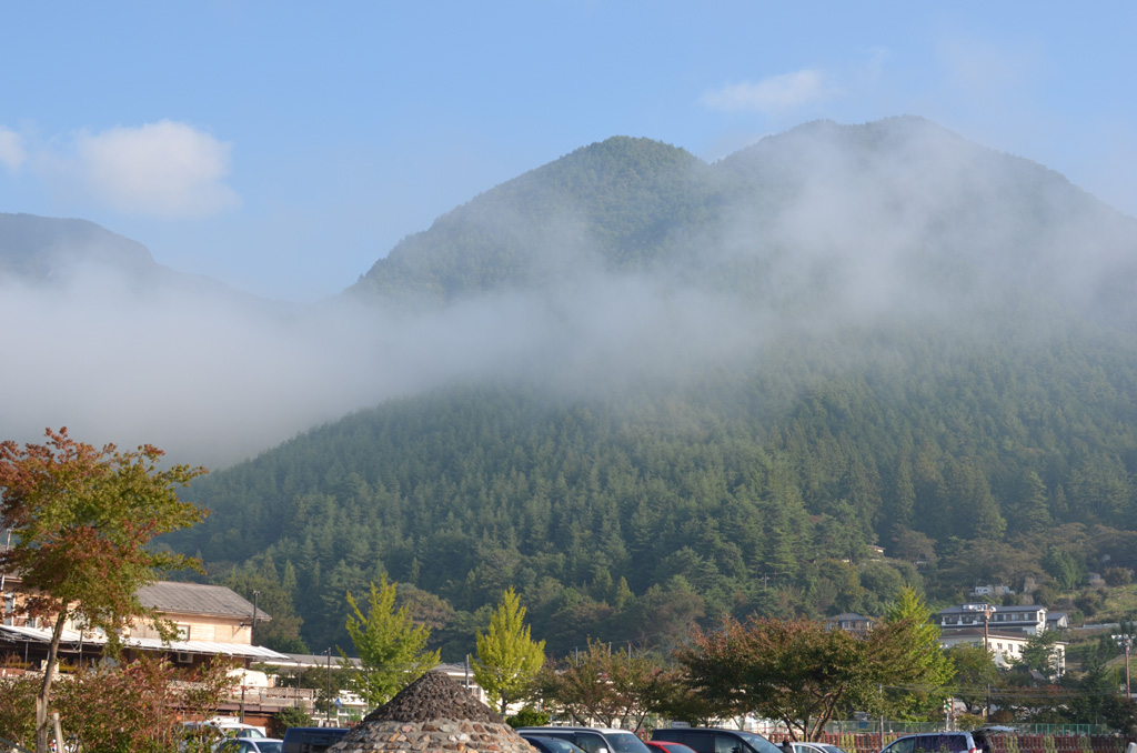 標高が高いところにあるせいで雲がとても近い。駐車場にも雲がかかっている感じ