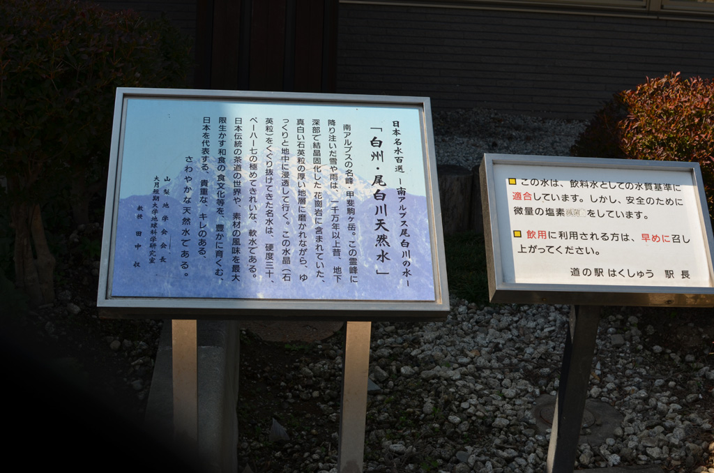 ここは水が綺麗で豊富なところを売りにしているようで無料で水を汲めるようだ。水汲み場では頻繁に人が押し寄せ水を汲んでいく。(写真) さすがに山梨県(南アルプスは有名)は天然水として名を馳せているだけあり、ミネラルウォーターが無料というのは非常に嬉しい。ちなみにミネラルウォーターの生産量第一位は山梨県。この辺りは他県に比べていかに水に恵まれているのかということがわかる。(写真)