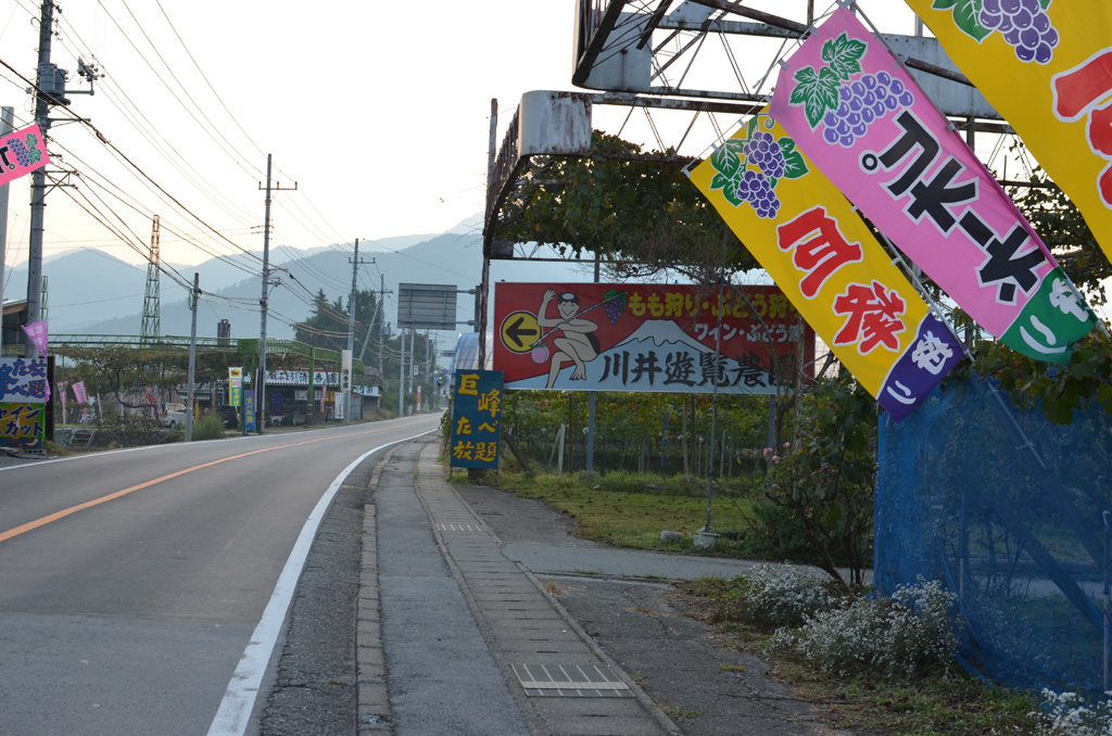 国道20号から県道22号に入り、笛吹ラインと呼ばれる県道34号に入ったときに道沿いに多数のぶどう園を目にする。さすがぶどう王国。ぶどうが多いからワインも多いのは定説で、ワイン好きにとってはたまらないところだろう。美味しんぼでも特集していたが、山梨のワインは日本の中でダントツに質が高いらしい。
