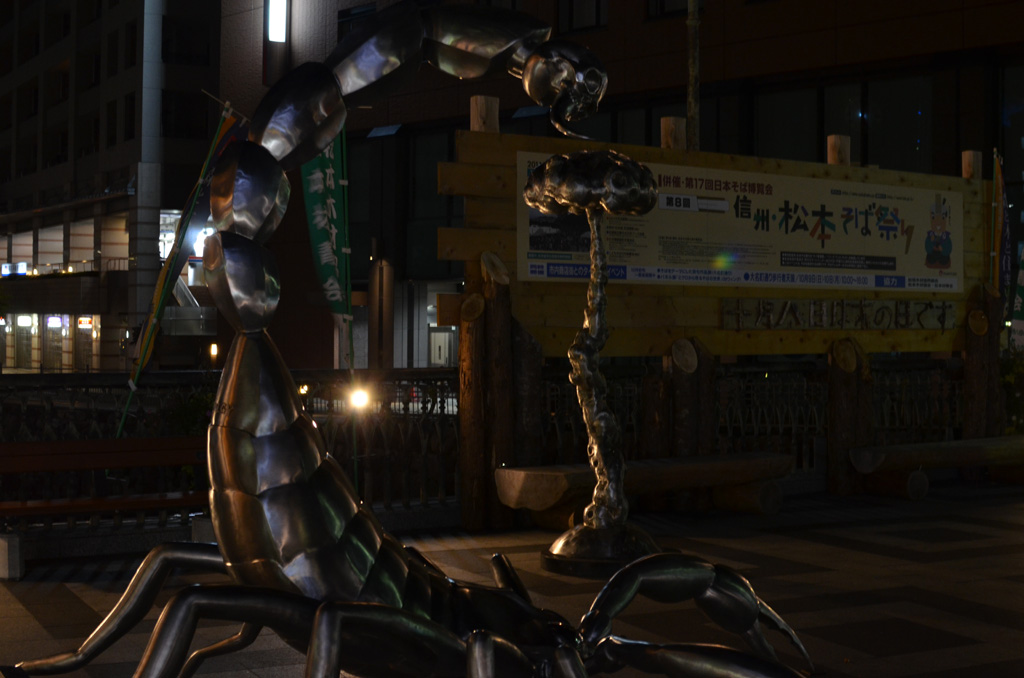 何とかよもぎこば林道との分岐点に戻り、命からがら松本市に入る。ホテルをチェックインしたあと、せっかくなので夜の松本市を探索する。