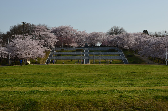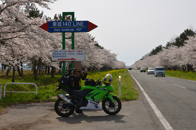 さきの桜並木には大勢の花見客が花見を楽しんでいた。写真の場所はちょうど東経140度。1キロ右にいけば北緯40度にも交わるらしい。ここは一直線の道が多い。さすが干拓地。本州なのに北海道のような平野が続くのは驚きだ。