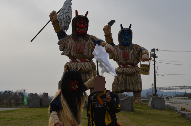 子供や家族連れと写真に入るのは違和感がないけど、ボクみたいなおっさんライダーと一緒に撮ってくれた優しい「なまはげ」