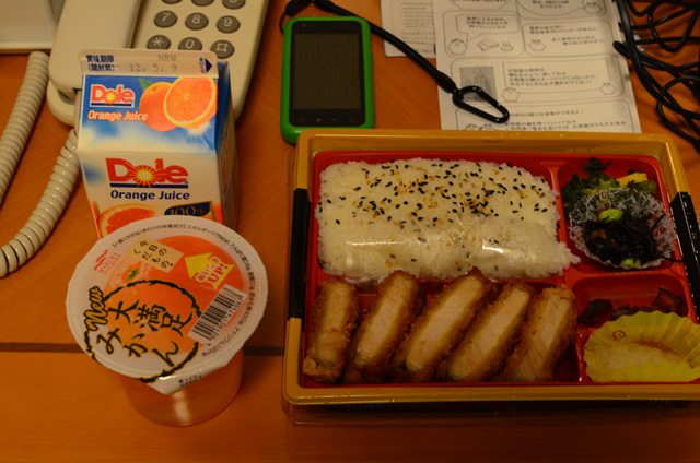 部屋に荷物を置いた後はいつものように夕食を求めて外に出るが、このホテル周辺は繁華街で居酒屋とコンビニしか見つけきれずに今日はコンビニ弁当(涙) 一応、頑張って「三元豚のおろしとんかつ弁当」で手を打った。(でも意外にウマかった)