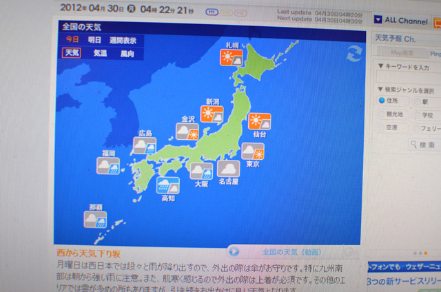 ウェザーニュースで全国の天気予報を確認すると西日本は全般的に曇り一時雨(もしくは雨一時曇り)になっていて、北日本のみ晴れ。これでボクの雨男の汚名は返上されたと思う。ただ、週間天気予報を見ると5/3から微妙に天気が崩れているのが気になる。予報が外れて最後まで晴天が続いて欲しい。