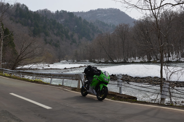 さらに国道341号を進んでいくと雪景色に変わる。寒いはずだ。川沿いの景色が素晴らしいが、こんな人気のない場所に長居しているとクマでも出てきそうなので、写真を撮った後は早々に立ち去る。
