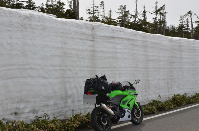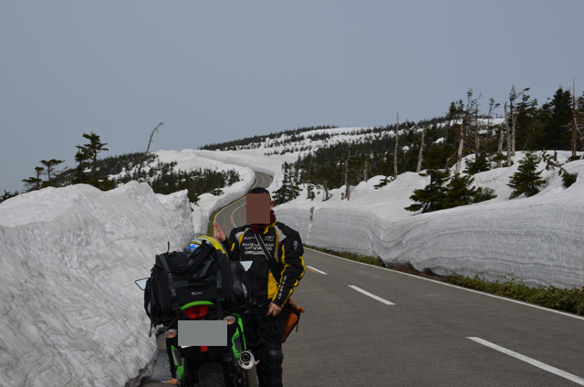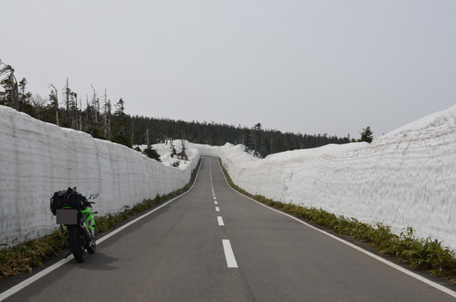 今回の東北ツーリングの目玉のひとつは八幡平アスピーテラインを走ること。雪の回廊として有名なところで早くそこを走りたい!と思いながら進んでいくと、そのうち峠道になる。その道を囲んでいる山々は大量の雪が積もっており、今にも雪崩が起きそうな気配。これ、怖いね・・・。雪崩防止のネットが所々に置かれているが、あれは効くのだろうか。周りにはクルマもまったく通っていないし、先に進むたびに目の前の雪の量に圧倒されてしまう。ここはかなり危険なところではないだろうか。