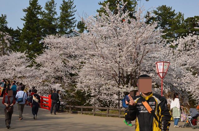 弘前公園に到着する。しかし公園前は大渋滞。ここは有名な桜の名所で、しかも市街地にある公園だから渋滞するのは当たり前。こんな事はここに来る前からわかっていたことなので、強引にどこかバイクのおける場所を探して公園を回る。すると、弘前市役所の前の駐輪場にバイクが数台停まっていたので、ボクもそこにNinjaを置いて弘前公園の中に入る。