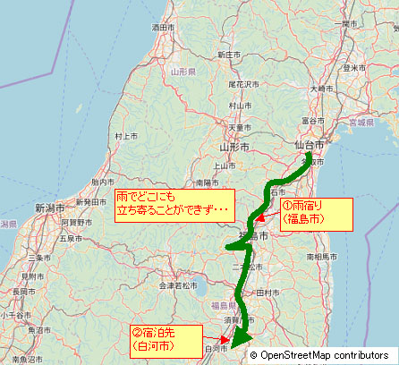 何時間走っただろうか。豪雨の中、福島市、郡山市を抜けてようやく白河市に入る。このとき、既に心身ともに疲れ切っていた。去年経験した北海道ツーリング2日目と同じぐらい辛かった。