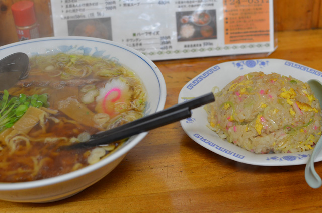 5分ほどしてラーメンと焼き飯がテーブルの上に置かれる。ラーメンを食べてみると汁はウマかったが、麺は太麺のせいか味が染み込まずにもったいない気がした。(味が染み込めばもっとウマくなる気がする) 焼き飯は普通にウマかった。