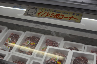 イノシシ肉は食べたことがあるけど、脂が乗っててうまかった記憶がある。売られているイノシシ肉は100g当たり500円と比較的高価。日帰りツーリングであれば買って帰りたいところだ。写真のものは一箱2000円。 |