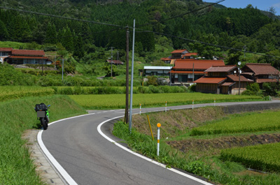 迂回した後、ナビが誘導してくれた県道の入り口手前に「この先、砂利道」の看板が出てきた。オフロードじゃないので砂利道は勘弁。さらに迂回して別の道を探すことに。