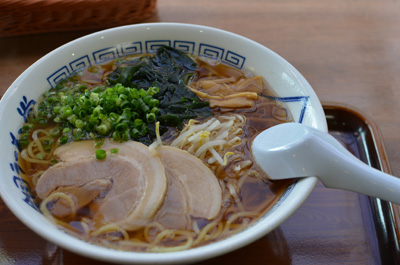お腹が減ってきたのでここで昼食にする。席に着くと「今日は日替わり定食はありません」の貼り紙が。メニューも乏しく、ラーメンとカレーの選択肢しかなかったので、(大盛)ラーメンを注文。