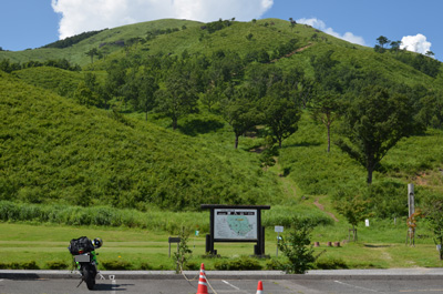 | 美都町から国道191号で広島に向けて南下していると、小高い道があったので登ってみると深入山がよく見えるオートキャンプ場に。登山登口(徒歩)が目の前にあったけど、この暑さの中で登山する気はさらさらないのでパス。ここでキャンプすると相当気持ちいいと思う。それぐらい景色がよい。 |