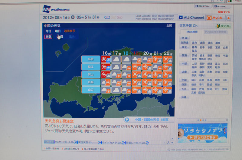8/16(木)~8/18(土)の天気は概ね良好。8/17(金)は曇り一時晴れだが、真夏のカンカン照りもきついので、若干曇りぐらいがちょうど良い。ただし空は青と白限定でお願いしたい。 |