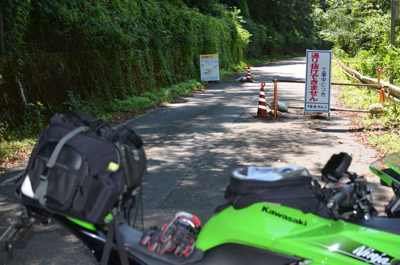 先をどんどん進んでいくと突然の通行止め。田舎の県道にありがちな工事によるものらしい。さすがのナビも通行止め情報まではインプットされていない。
