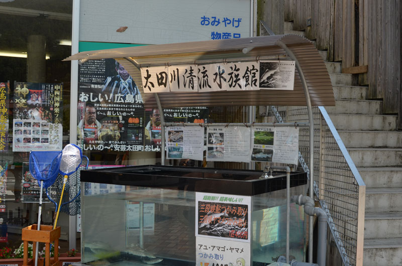 | 道の駅入り口前におかれたヤマメの掴み取りの水槽。国道191号を走っていたとき、ヤマメの看板がやたらと目立っていたけど、このあたりはヤマメが名物らしい。 |