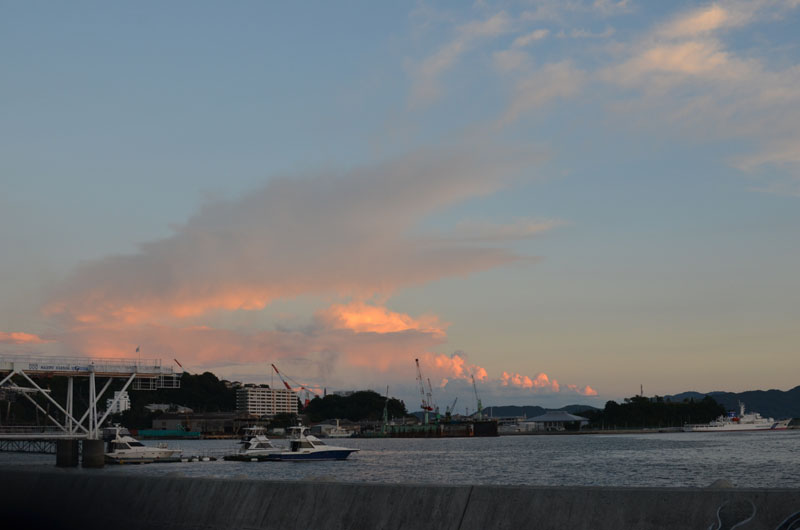 | 呉といえば造船。戦時中は日本屈指の軍都であり、呉は船のイメージが強い。戦艦大和もこの地で生まれた。戦時中は日本屈指の大都市であったらしいが、現在は広島県内でも人口第三位の中核市だ。夕日も似合う呉の街。 |