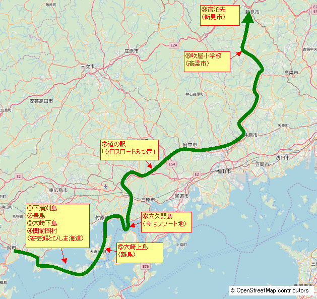| 14時半に忠海港を出発して今度は広島を北上する。途中、尾道市の道の駅、「クロスロードみつぎ」というところで休憩。このペースだと今日は岡山北部の高梁や新見までが限界というところか。 |