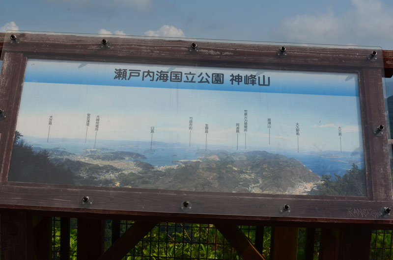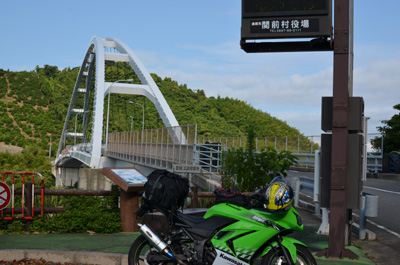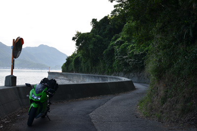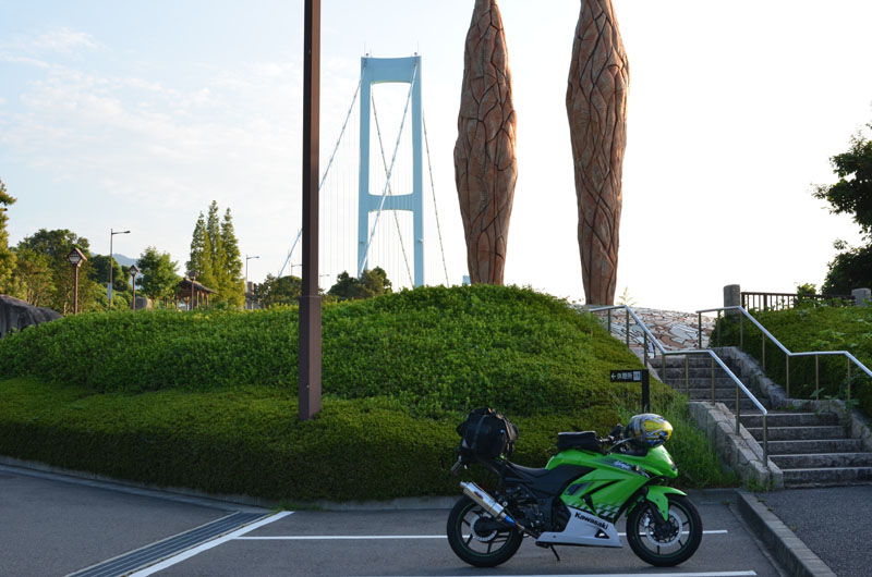 6時にホテルを出発し、まずは下蒲刈島に向かう。安芸灘大橋有料道路を渡ったすぐ先にある展望台にNinjaを停める。橋を制限速度+α+αで渡っていると、後ろからものすごいスピードで追い抜きをかけられた。(軽自動車でじいさん) 島の人間というと比較的のんびりしている印象があるのだが、そうではないらしい。