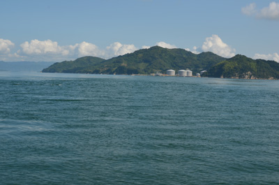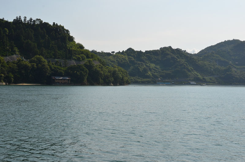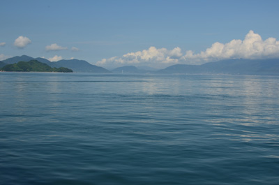 フェリーが関前村にかかる橋を通過する。フェリーから見る海の景色はサイコー!Ninjaと一緒に海を見るのは初めてだ。 |