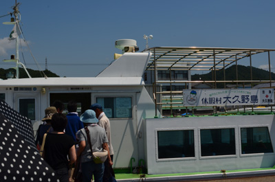 忠海港から大久野島までの所要時間は12分。乗り込む船はポンポン船に毛が生えた程度の船で、しかも大勢の観光客でごった返し。 |