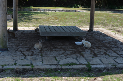 | お、さらにいっぱい寄って来た。辺りはウサギだらけだ。ウサギ好きにはたまらない島だろう。ちなみにこの島には当然ペットの持ち込みは禁止されている。他の動物がいたら島のウサギの生態が脅かされるからだろう。 |