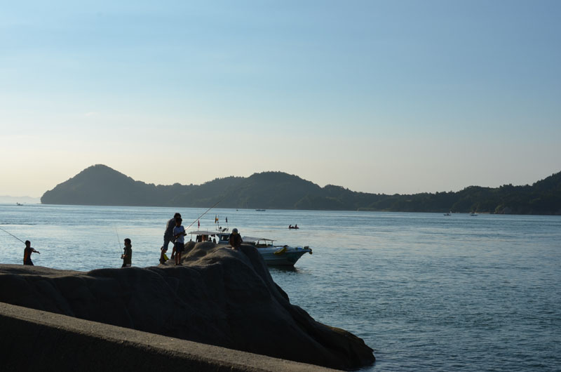| 上蒲刈島の県道から少し外れて「県民の浜」という施設に沿って走っていると、朝早くから釣りをしている人がいる。一体何が釣れるんだろうか。 |
