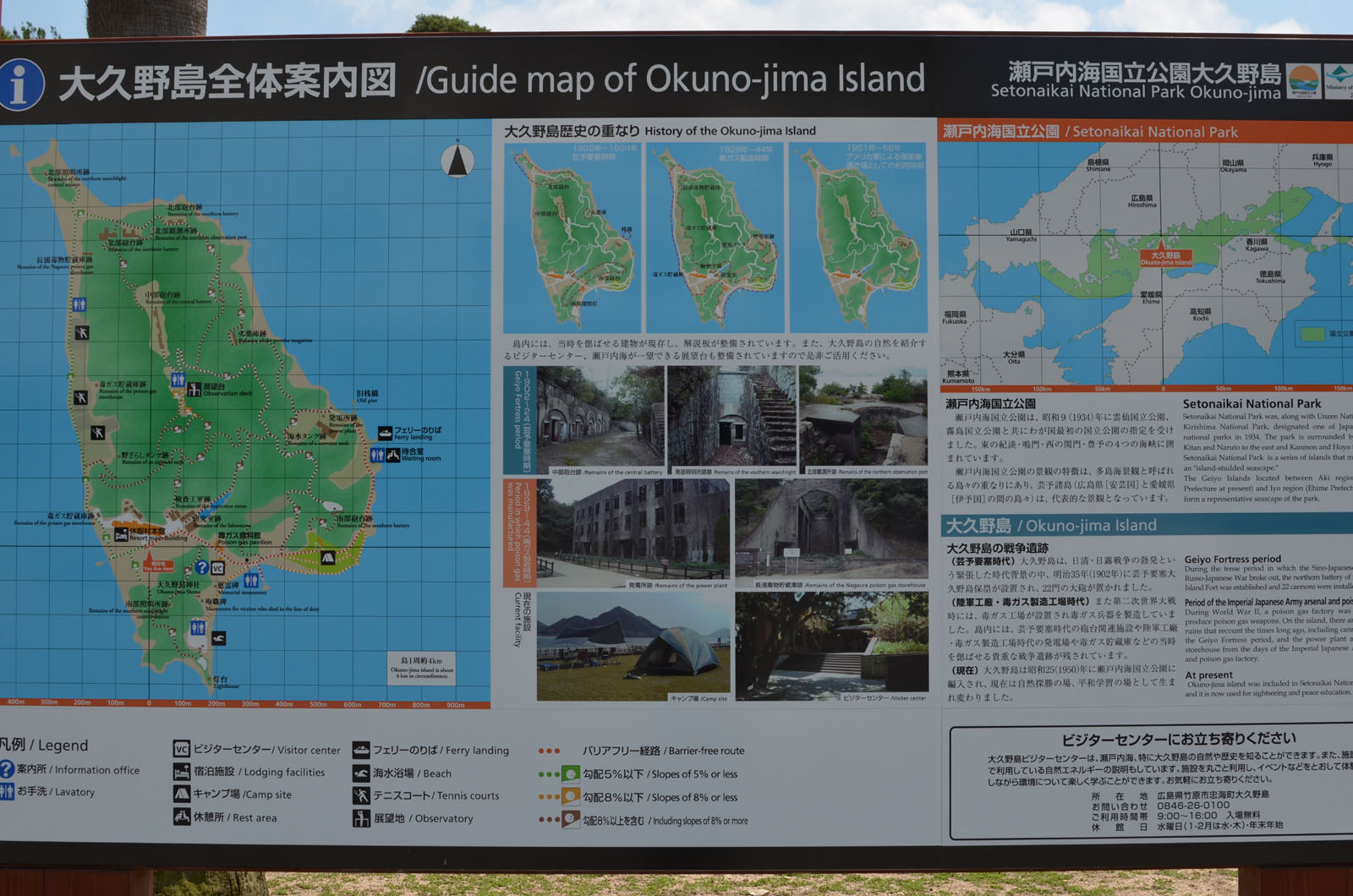 大久野島の案内看板。キャンプ場などの憩いの場と毒ガス資料館など、戦時中の負の遺産が混在する不思議な島。