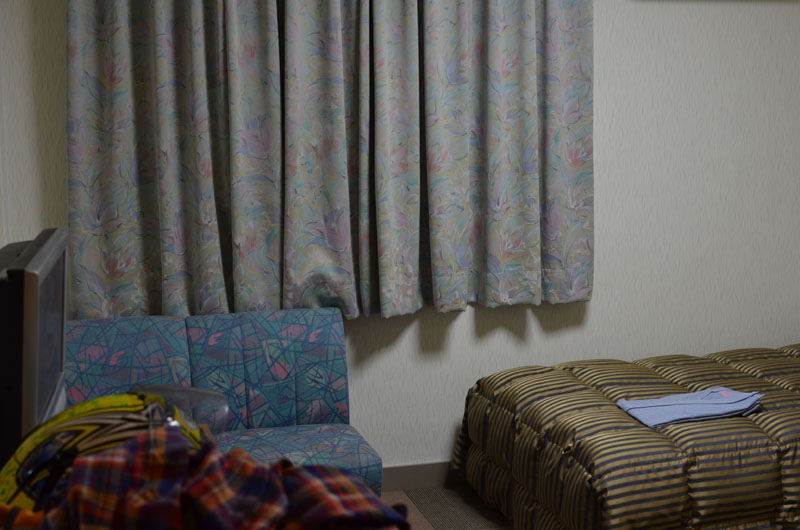 ホテルは予想通りかなり老朽化している。しかも部屋は喫煙しか空いておらず、タバコを吸わない人間にとっては苦痛な事この上ない。ホテルが古い上に喫煙ルームで散々だけど、バイクは車庫に駐車させてもらえたし、部屋はなぜかツインだし、まあいいか。 |