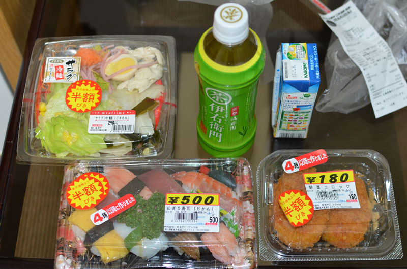 結局、ホテル横のスーパーにて半額シールが貼られた惣菜の売れ残りをゲットしてきた。これだけ買って飲み物2本まで付けて685円という破格さ!