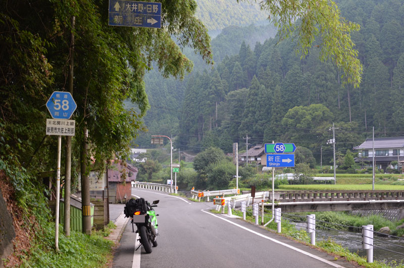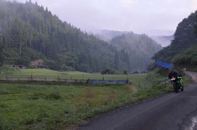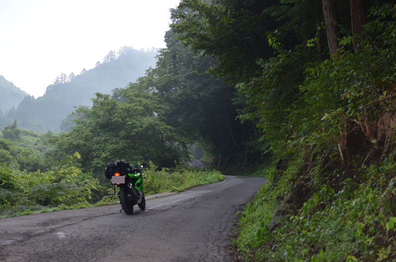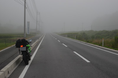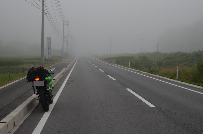新庄」を目指す。出発したときはそうでもなかったが、標高が高くなると霧がいっそう凄くなり、数十メートル先が真っ白で何も見えない状態になる。Ninjaを停止しているときもテールランプを点けておかないと危険だ。 |