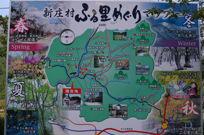 ここは新庄村というらしく、「ひめっ子雑煮」という雑煮が名物らしい。地図をよく見ると北が右向きという珍しい看板。