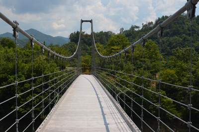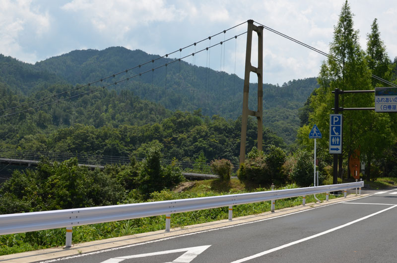 ゴムボートを抱えた人が対向からやってきた。このあたりの河川で泳ぐことができるのだろう。吊橋を渡ってみると意外に頑丈で怖さは感じられない。吊橋を途中で引き返し、再び国道を下る。 |