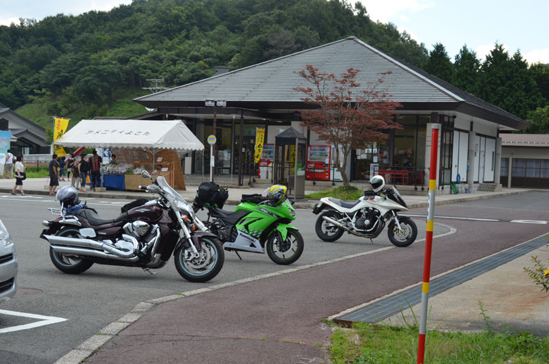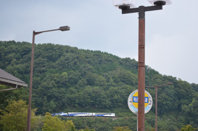 道の駅の向こうに汽車が汽笛を鳴らして走っている。ツーリングだと電車や汽車を意識しないので、あれが何線なのかまったくわからない。 |