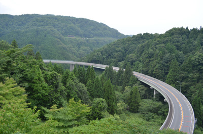 | 道の駅からすこし外れた先にループ橋がよく見える展望台があったので、そこで写真撮影。このループ橋をおろち(大蛇)に例えているのだろう。 |