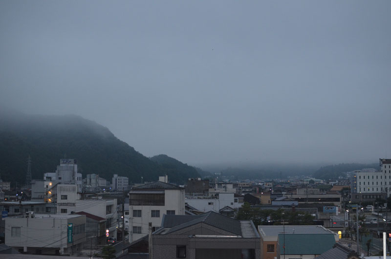 | 外を確認すると薄暗いが霧で覆われている。新見は標高の高い位置にあるので霧が多いのだろう。昨日はわからなかったが全体的に古い建物が目立つ。 |