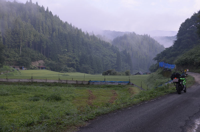 峠を降りてきたら田んぼが見えてきた。こういう明るいところなら険道でも楽しめる。田舎の雰囲気全開だ。 |