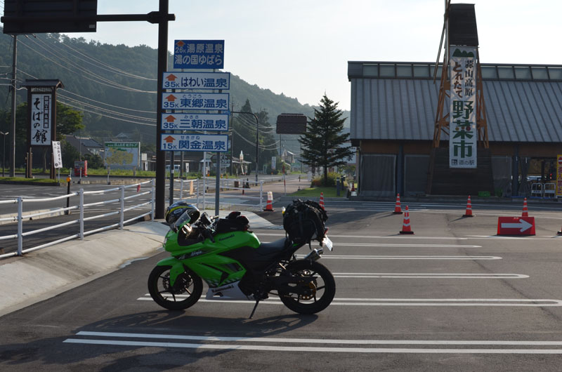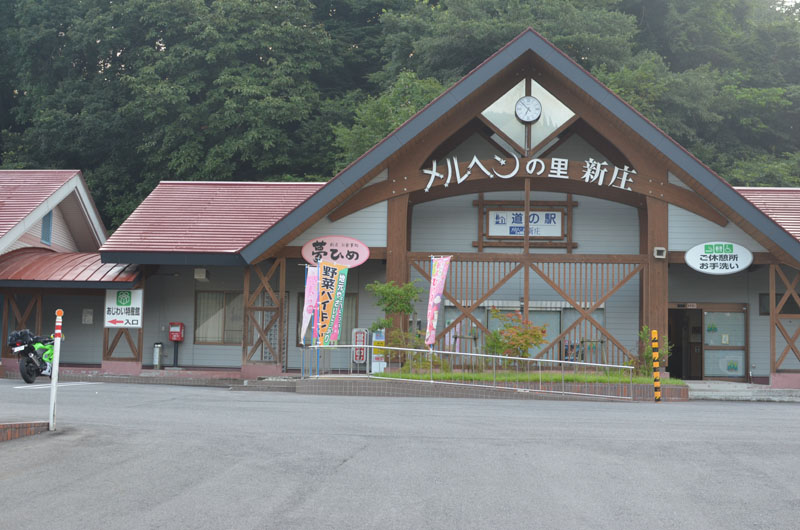 | 道の駅「メルヘンの里 新庄」に到着。朝早いので中は開いておらず、クルマも1台停車しているのみ。山の上のせいか、または朝早いせいか、暑さは感じない。 |