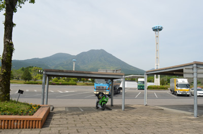 宮崎自動車道の霧島SAで見る空は白に覆われている。これは黄砂の影響だろうか。後ろの霧島連山も薄く白がかっている。青い空が欲しい。