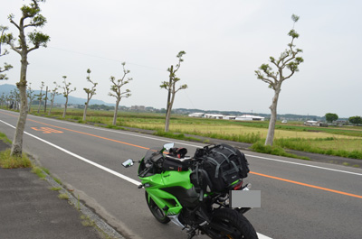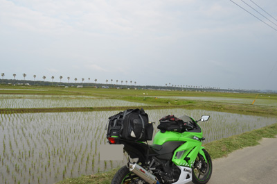 道の駅フェニックスを出て宮崎市に入る手前にて。宮崎市の手前だけど田園風景が目立つ。遠くには椰子の木が並んでいる。