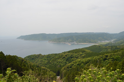 | 道の駅フェニックスから見下ろす景色。絶景やね。空に薄い青が目立つようになってきた。ここまでほとんど白い空だったので。 |