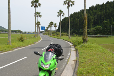 | 都井岬を出て、宛てもなく日南海岸をひらすら北上する。国道を走っていると所々で椰子の木が目立つようになってきた。この木は宮崎を象徴する木なので、これを見ると宮崎に来た~という感じになる。 |