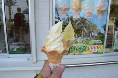 プレミアム日向夏というソフトクリームを食べてみると、激ウマ!日向夏の蜜がかかっていて、ソフトクリームとよく合う。店の前で食べていると飛ぶように売れていた。 |