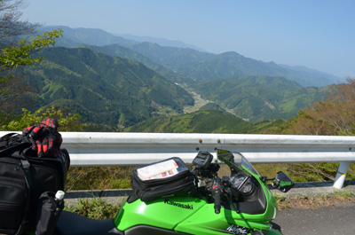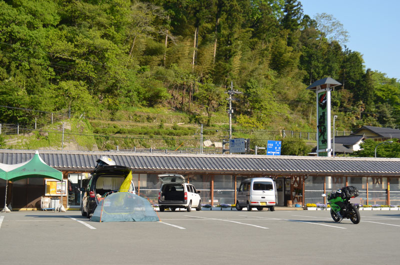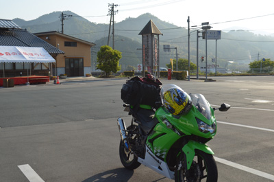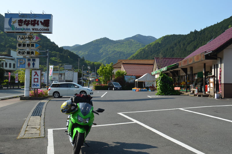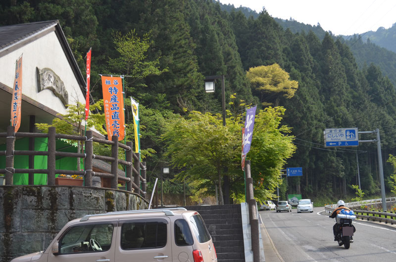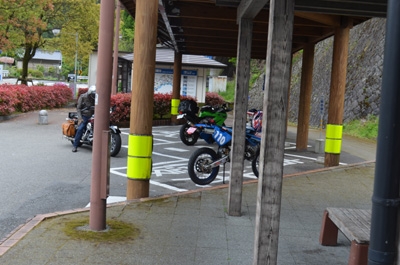 | 国道439号をさらに東に進んで徳島県に入った先の道の駅「大杉」にて。手前に移っている125ccのモタードバイクは四国カルストからここまでの間、ほとんど一緒に併走している感じだ。(実際には併走していないが、道の駅で休憩する度に出会っている) |