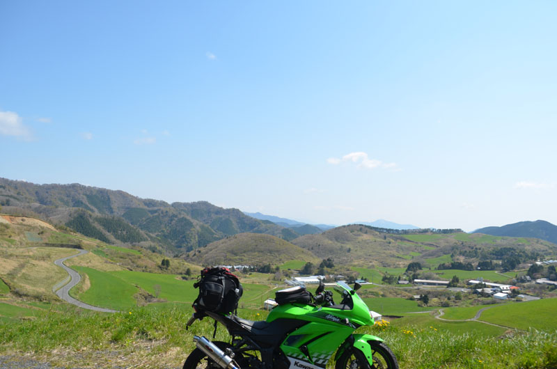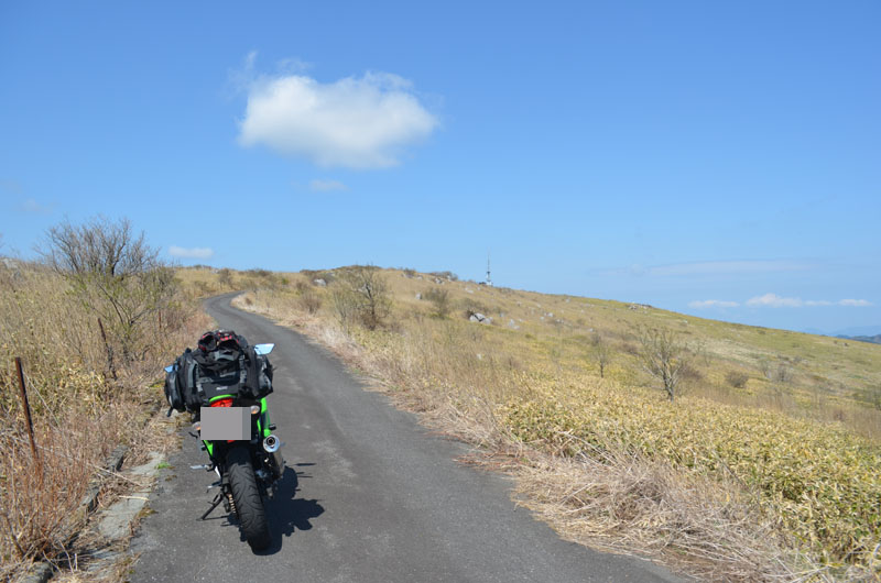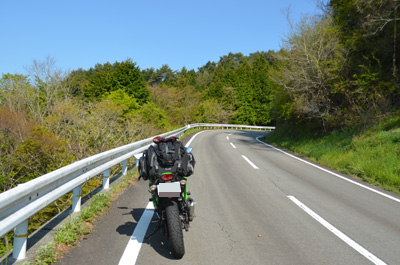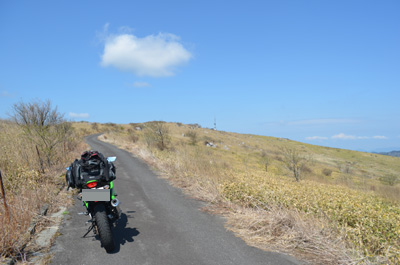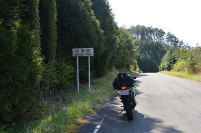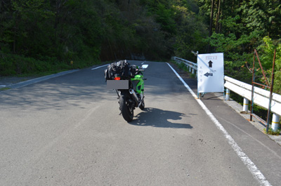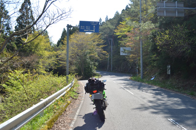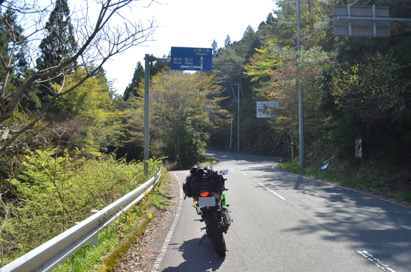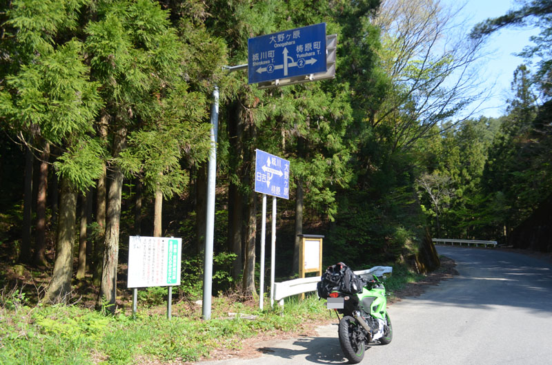 | 20分ぐらい走っただろうか。県道2号との分岐点で写真を撮っていると、初めて対向からバイクが通り過ぎていった。この辺りは大茅峠というらしい。 |